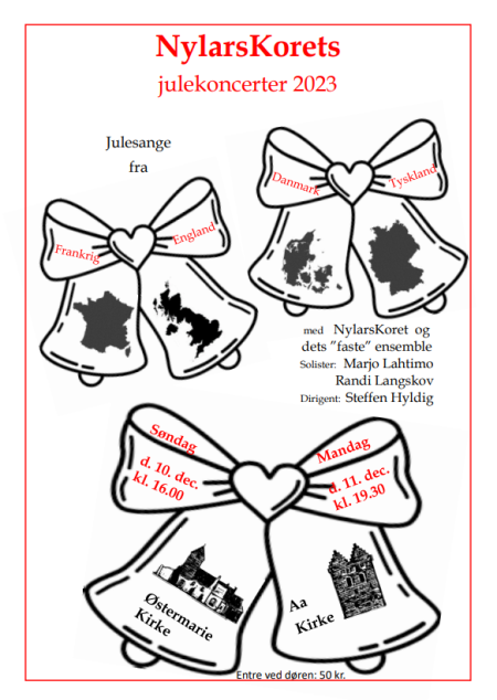Nylarskoret afholder julekoncerter søndag d. 10. december kl. 16.00 i Østermarie Kirke og mandag d. 11. december kl. 19.30 i Aakirke. Koret og orkester ledes af dirigent, Steffen Hyldig.