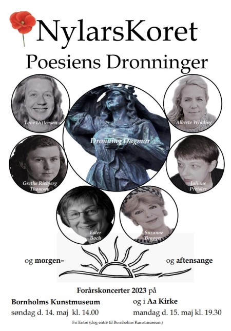Denne gang byder Nylarskoret på en perlerække af nyere, danske , iørefaldende sange udsat for flerstemmig kor: Repertoiret består dels af lyriske morgensange og aftensange, dels sange om forår, lyset, naturen og kærligheden. Fælles for dem er, at kvindelige digtere, som Suzanne Brøgger, Tove Ditlevsen, Alberte og Juliane Preisler har skrevet de smukke tekster. Derfor er Poesiens dronninger vores hovedtema. Mange kender sikkert Albertes ”Lyse Nætter”. Den synges her i et dejligt fire- og femstemmig korarrangement af Line Groth. Måske kender man også Matti Borg og Juliane Preislers skønne aftensang: Et hav, der vugger sig til ro? Den går lige i hjertet på os, som lever med havet tæt på!