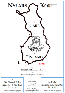 NylarsKoret markerer Carl Nielsens 160 år med sang og fortælling - og Carl Nielsen får finsk selskab. Forårskoncert i Skt. Nikolai Kirke lørdag d. 3. maj kl. 16.00 Forårskoncert i Aa Kirke mandag d. 5. maj kl. 19.30 Alle kender vist sangene: ”Jeg ved en lærkerede” og ”Solen er så rød, mor”. Melodierne til disse sange er komponeret af den danske komponist, Carl Nielsen, som også har komponeret mange andre kendte salmer og sange i Højskolesangbogen. Ud over store orkesterværker, symfonier mv. har han også komponeret ”Fynsk Forår” og ”Maskerade”, værker for kor, orkester og solister.I år fylder Carl Nielsen 160 år. Det vil NylarsKoret fejre med sang og fortælling, der binder værkerne sammen. NylarsKoret opfører derfor en perlerække af Carl Nielsens fine sange. Og der vil både være muntre, stemningsfulde og sværmeriske sange imellem, nogle af dem arrangeret af John Høybye.Derudover opføres udvalgte satser af Fynsk Forår for kor, solister, akkompagneret af organist Anders Forsberg Svendsen på klaver, satser hvor foråret prises og der bydes op til dans. Koncertprogrammet består også af et par dybsindige finske sange og folkeviser.Og hvorfor så finske sange? Fordi NylarsKoret tager på kortur med ”Carl Nielsen” til Finland i efteråret. Men først er det forårskoncerterne det gælder! NylarsKoret håber at give tilhørerne en stemningsfuld oplevelse med mange forskellige følelsesmæssige udtryk i det varierede program.Dirigent og fortæller er naturligvis Steffen Hyldig, Nylarskorets faste dirigent gennem 49 år.Entré 50 kr. ved indgangen.